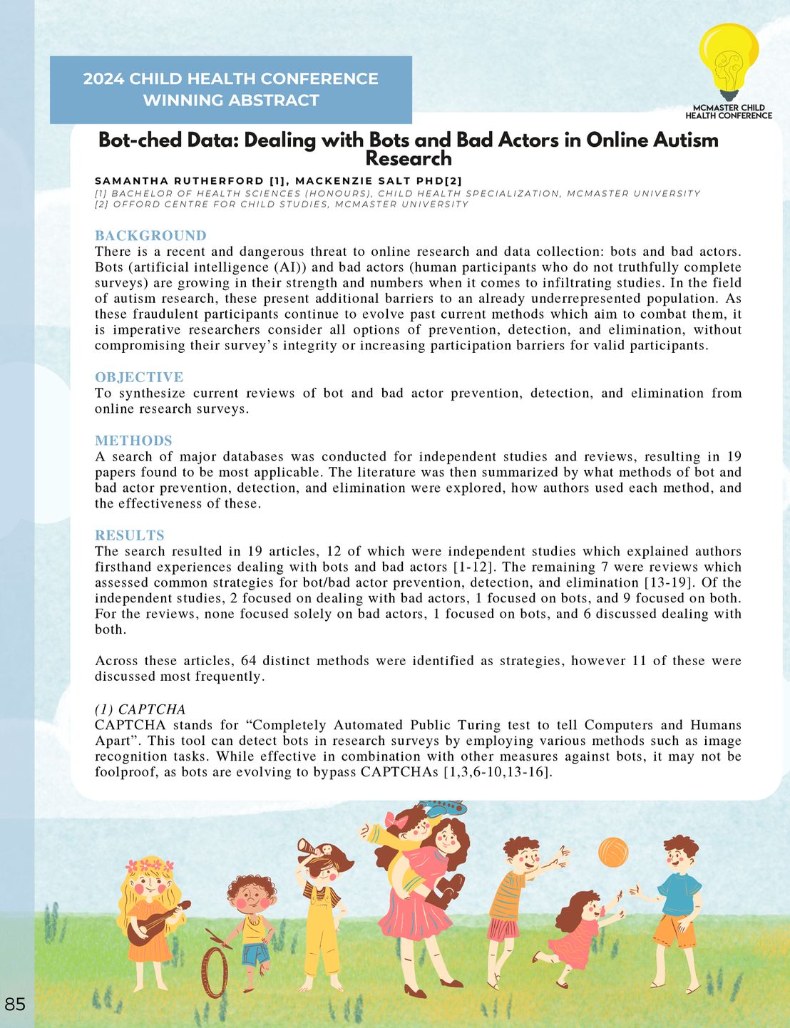 Conclusion: Current strategies employed to tackle bots and bad actors in online autism research is a complex and nuanced landscape. A synthesis of 19 relevant studies revealed several distinct approaches. However, none of these methods are completely effective in isolation. This emphasizes the necessity to combine multiple strategies to enhance their overall efficacy. Another recurring concern surfaces throughout the discussion: the imminent obsolescence of current strategies in the face of rapidly evolving AI capabilities. While these methods can have effective outcomes, the relentless progress of AI technologies poses a formidable challenge to their sustainability. Thus, it becomes evident that a dynamic and adaptable approach is needed. Researchers across disciplines must collaborate to find novel method combinations and novel strategies. As the use of online questionnaires in all research—especially studies on autism and other underrepresented populations—continues to grow, it is increasingly important to keep participation barriers low while collecting valid data.